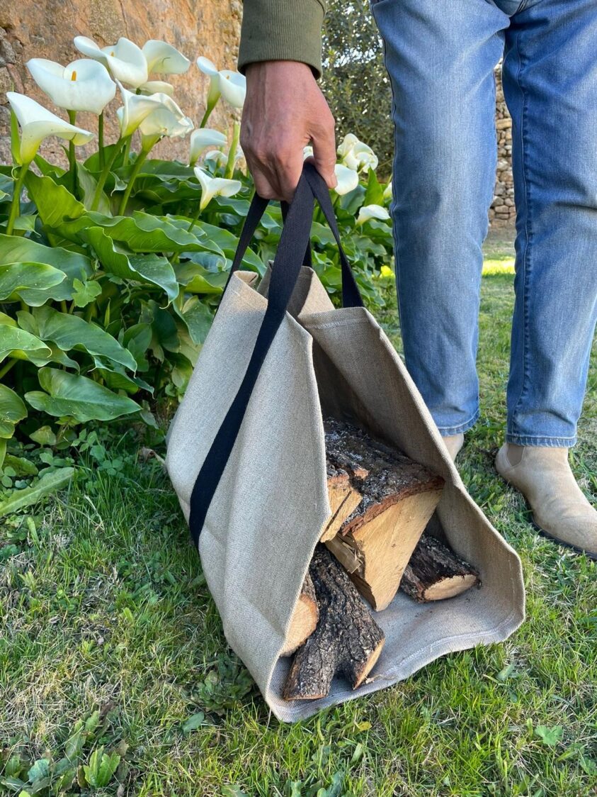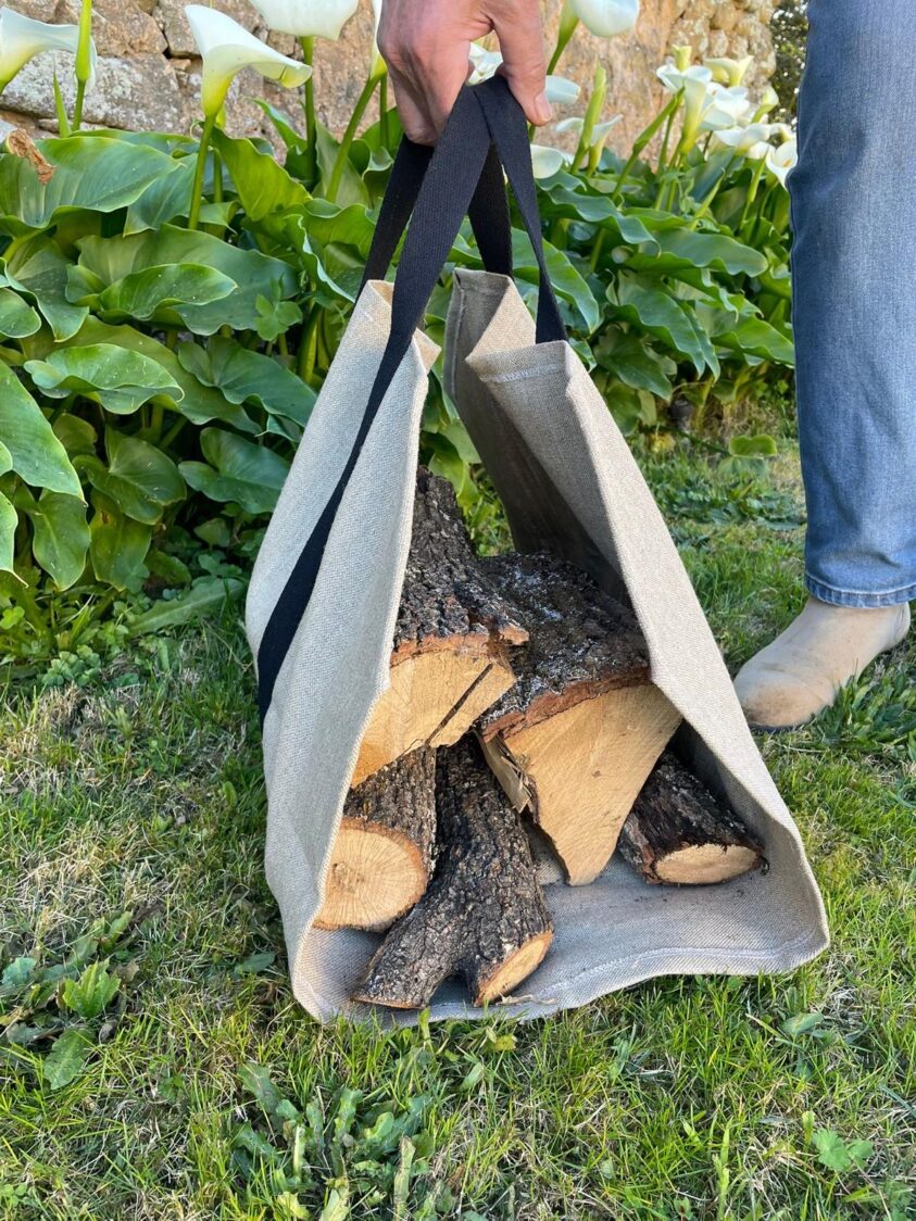 Práctico transportador de leña confeccionado en lona resistente, pensado para facilitar el traslado de los troncos desde el exterior hasta la chimenea. Su diseño abierto permite cargar y descargar la leña con comodidad, mientras que las asas largas de cinta reforzada aseguran un agarre firme.