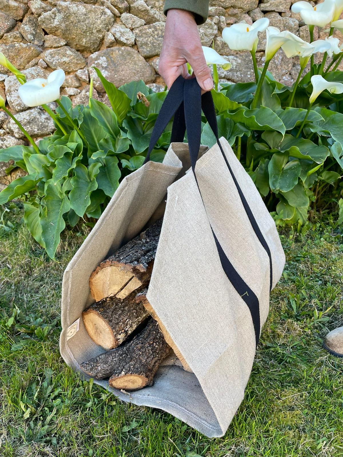 Práctico transportador de leña confeccionado en lona resistente, pensado para facilitar el traslado de los troncos desde el exterior hasta la chimenea. Su diseño abierto permite cargar y descargar la leña con comodidad, mientras que las asas largas de cinta reforzada aseguran un agarre firme.